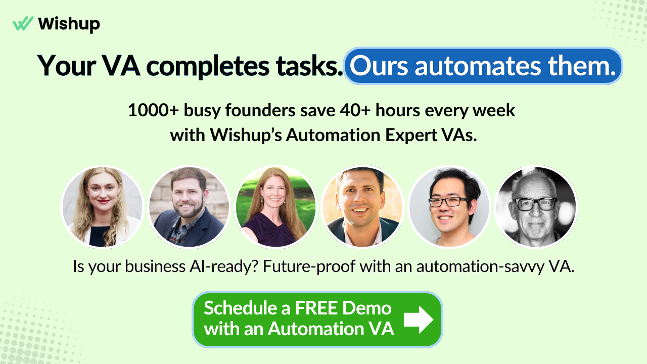 Whether you’re a founder, startup, or growing business, Wishup lets you hire an AI-enabled virtual assistant in as little as 60 minutes. No job postings, no weeks of interviews, and no guesswork around quality. That’s what sets Wishup apart as a fast, reliable, and high-quality VA partner.