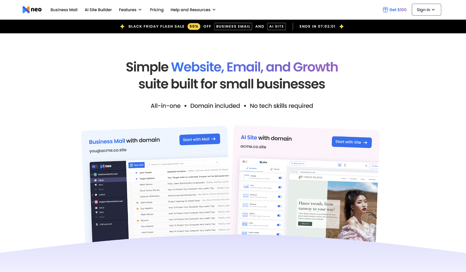 - Offers business email with a free .co.site domain, an AI-powered website builder, and built-in tools for marketing, scheduling, and communication.
