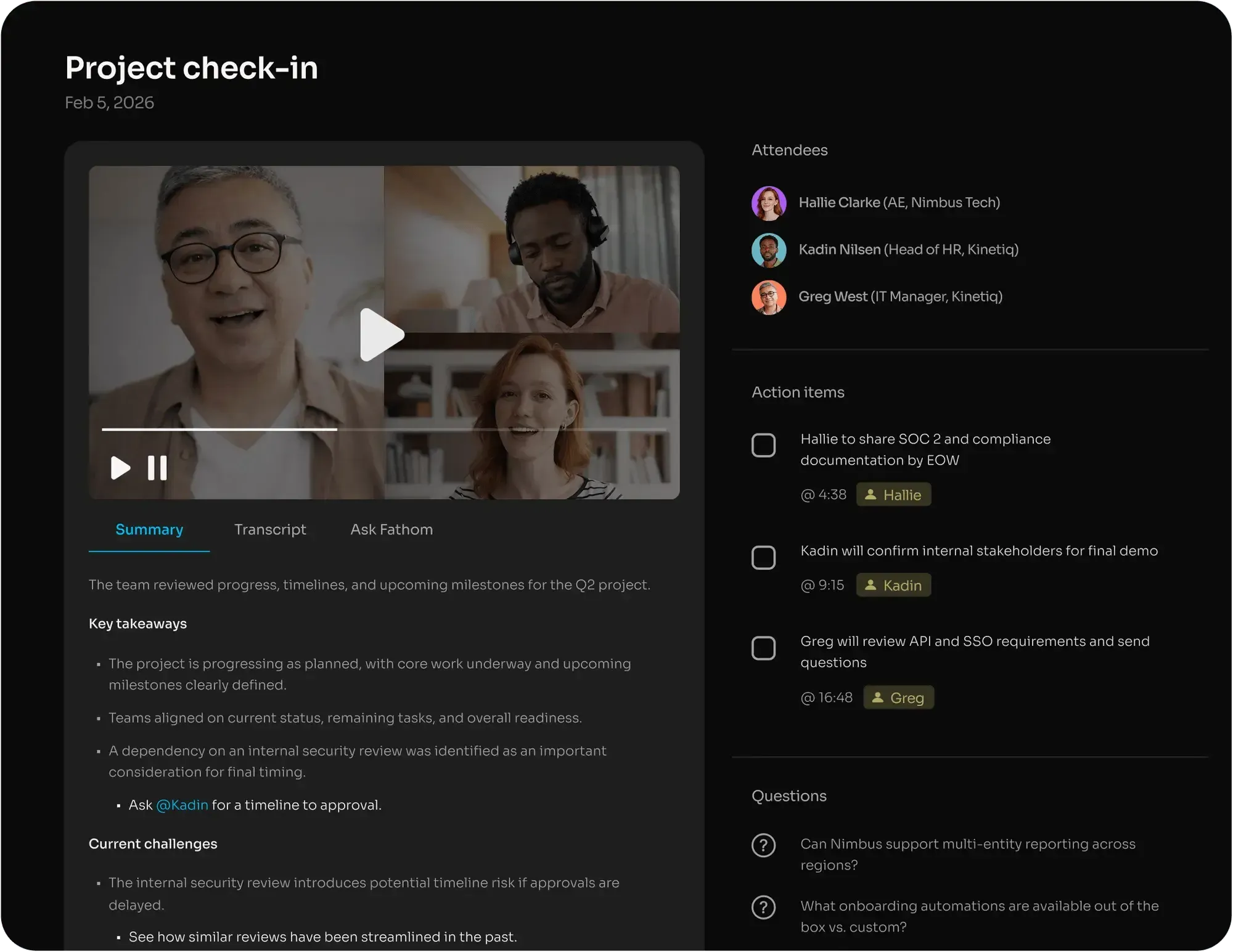 For VAs managing executive schedules and for managers running distributed teams across time zones, Fathom eliminates the most time-consuming post-meeting task: note-taking.