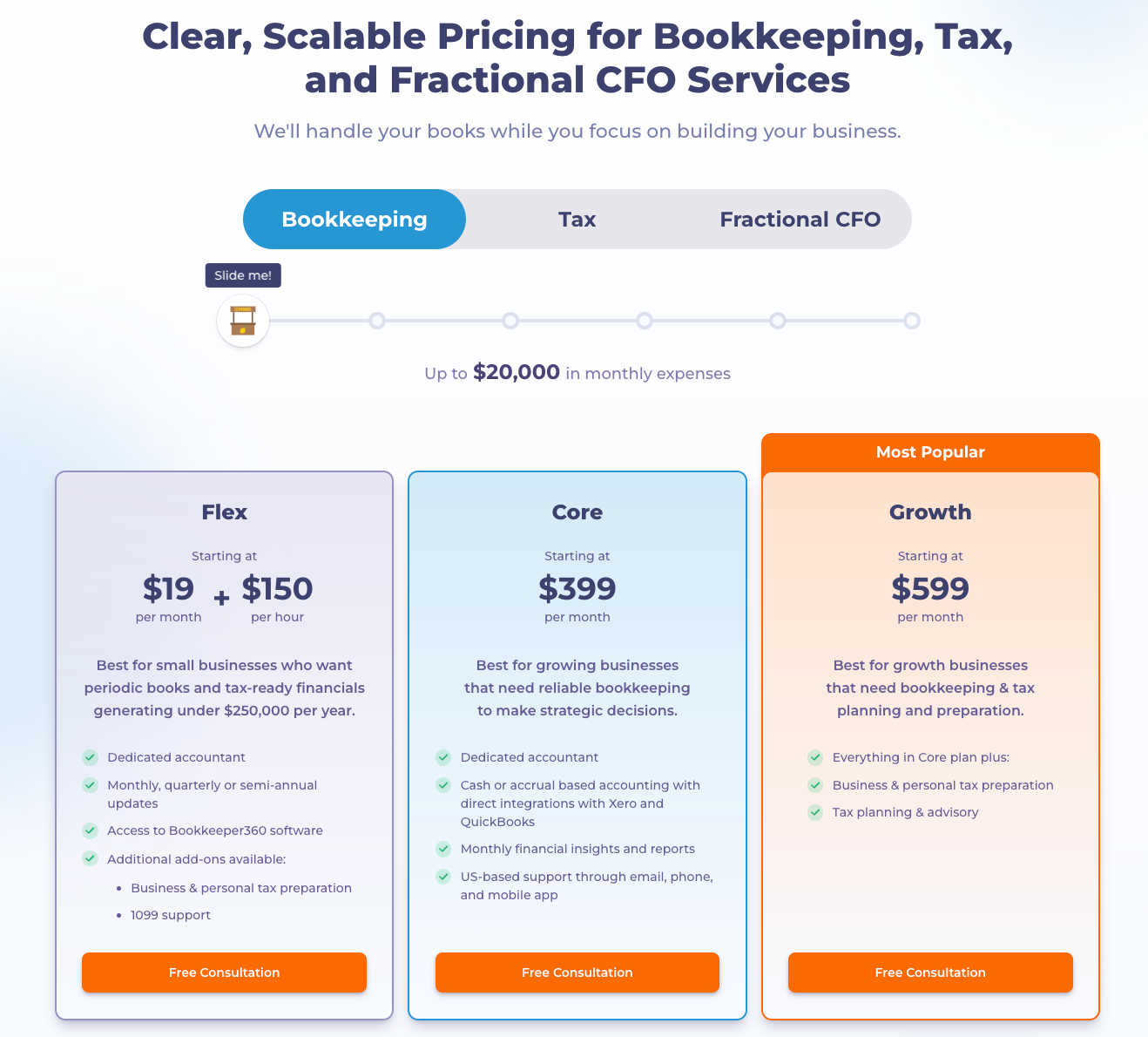 For monthly bookkeeping, Bookkeeper360 offers fixed packages starting at $399/month. If your monthly business expenses are under $20,000, you’re in the base tier. As expenses rise, pricing scales: $899/month for up to $100,000 in expenses, and $999/month for anything higher.