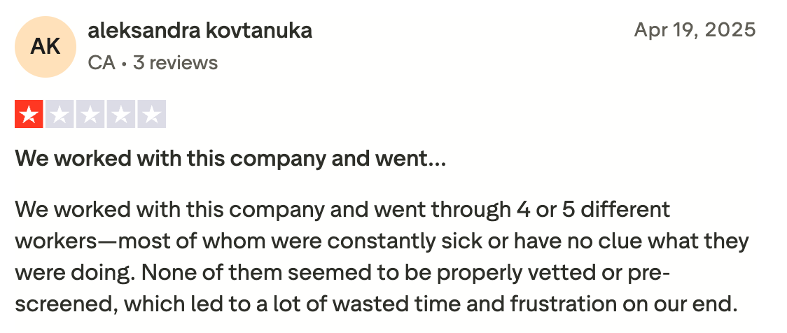 - Several reviewers mention gaps in vetting, along with instances where clients had to switch VAs more than once, suggesting challenges with consistency or role fit.