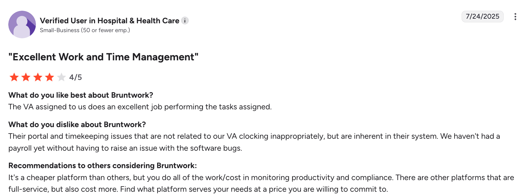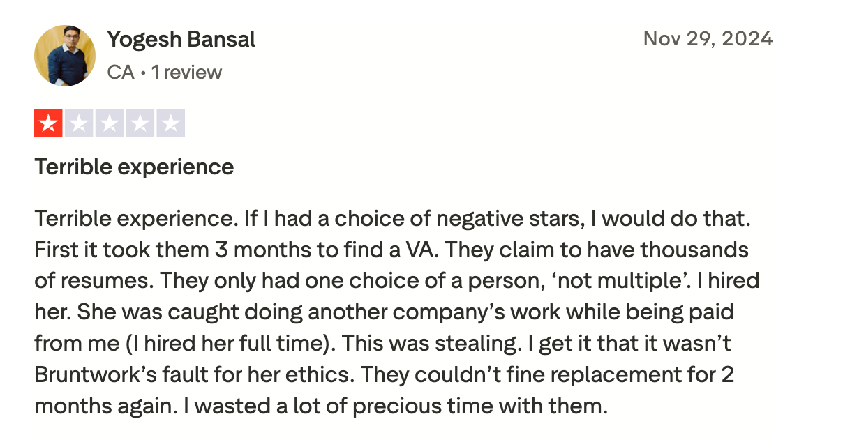 - A user reported an incident involving a Bruntwork VA allegedly doing work for another company while being hired full-time, raising concerns about oversight and commitment.