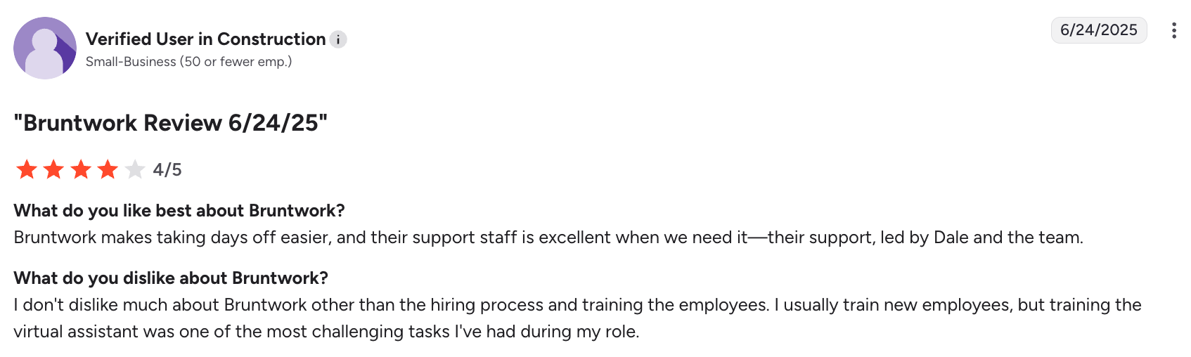 - Some clients mention that they need to invest time training their Bruntwork VAs, which can feel demanding depending on the role.