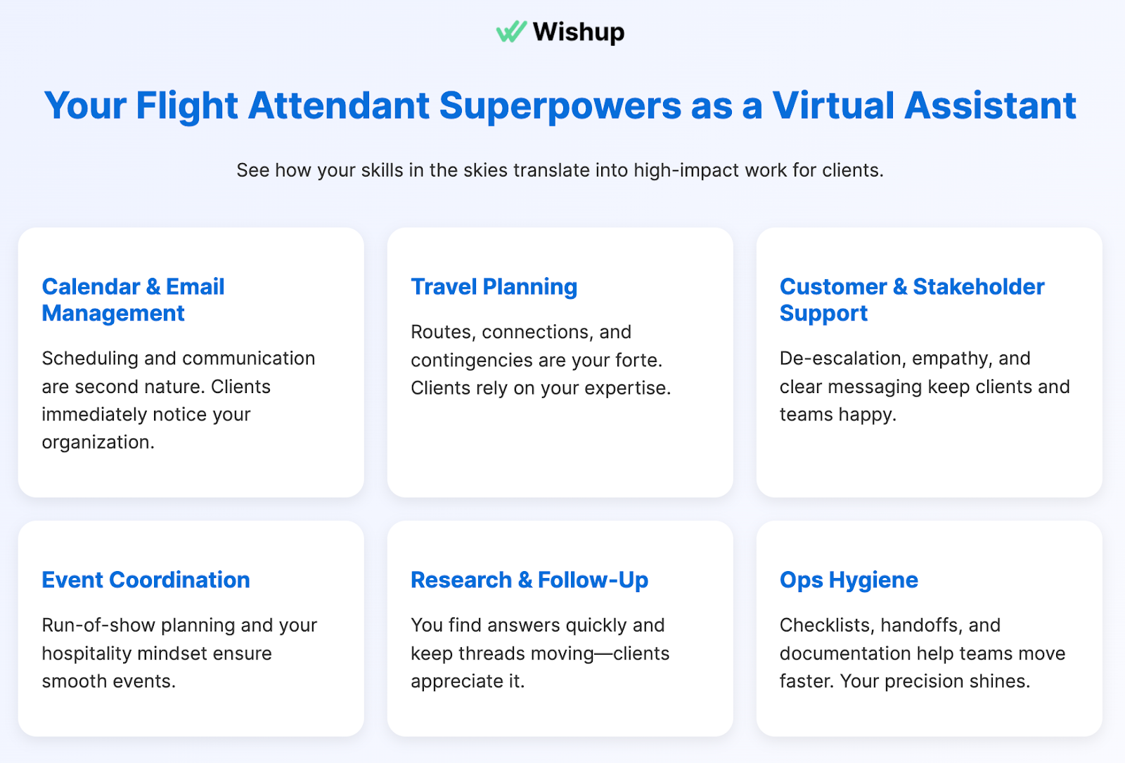 In the next section, we’ll break down exactly which flight attendant skills make you a natural fit for a virtual assistant career and how you can start leveraging them right away.
