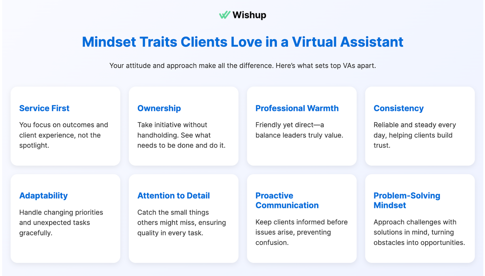 - Training led by expert managers who have trained 1,000+ Wishup VAs