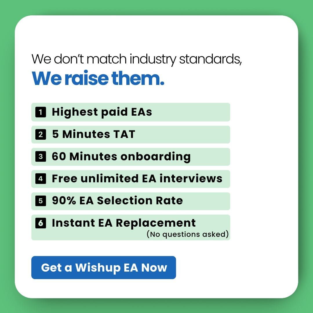 Vetting standard: Most providers hire from the top 2% to 5% of applicants. Wishup hires from the top 0.1% through a 6-step in-person vetting process overseen by ex-entrepreneurs. The talent pool is fundamentally different in quality and reliability.