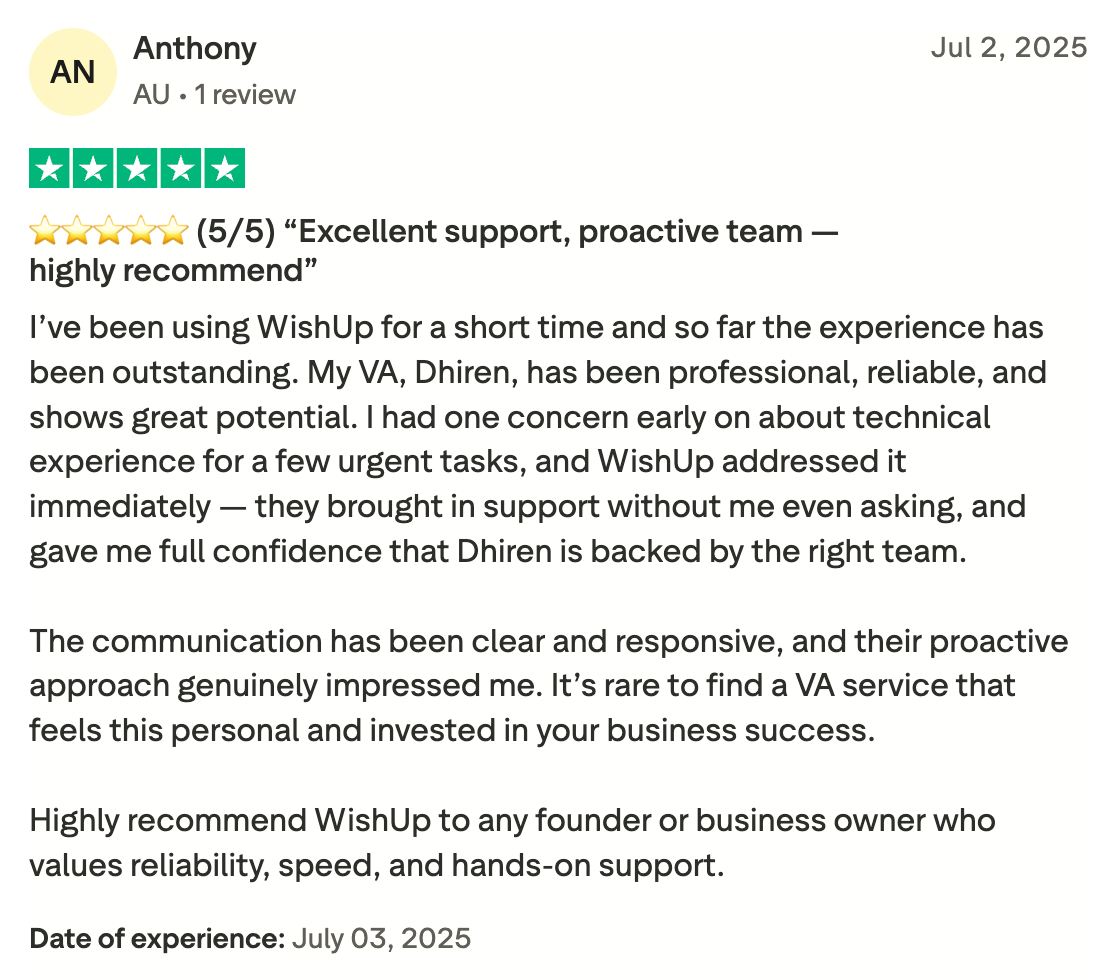 Wishup helps you hire a virtual assistant in 60 minutes because we understand how startups and small businesses work. This rapid deployment is ideal for founders needing immediate assistance, such as managing a sudden influx of customer inquiries or preparing for a product launch.