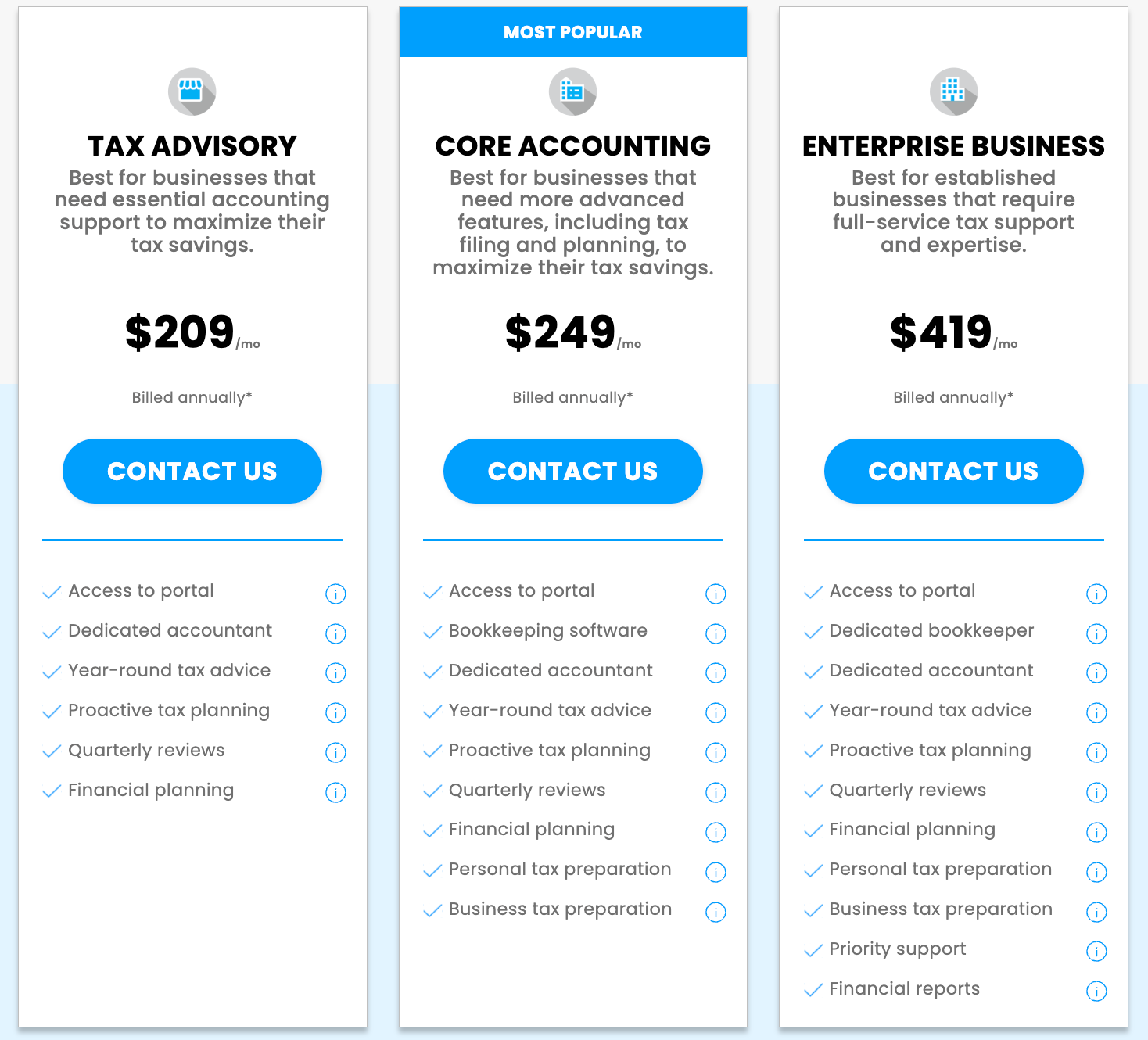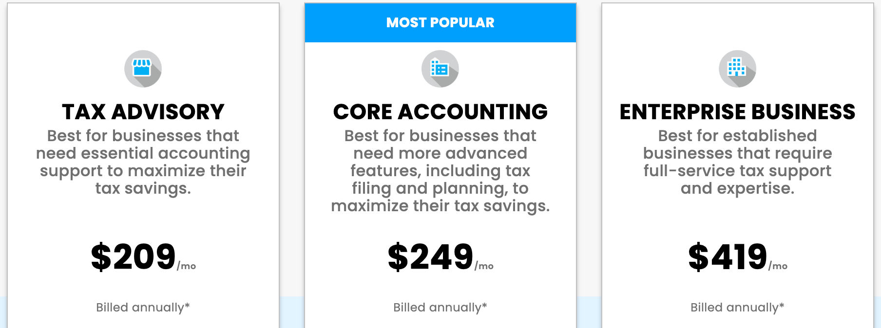 ii) 1800Accountant plans start at $209 per month for tax advisory, and if you need core accounting, $249/month is the cost, and for enterprise business, they charge $419 per month, all billed annually.