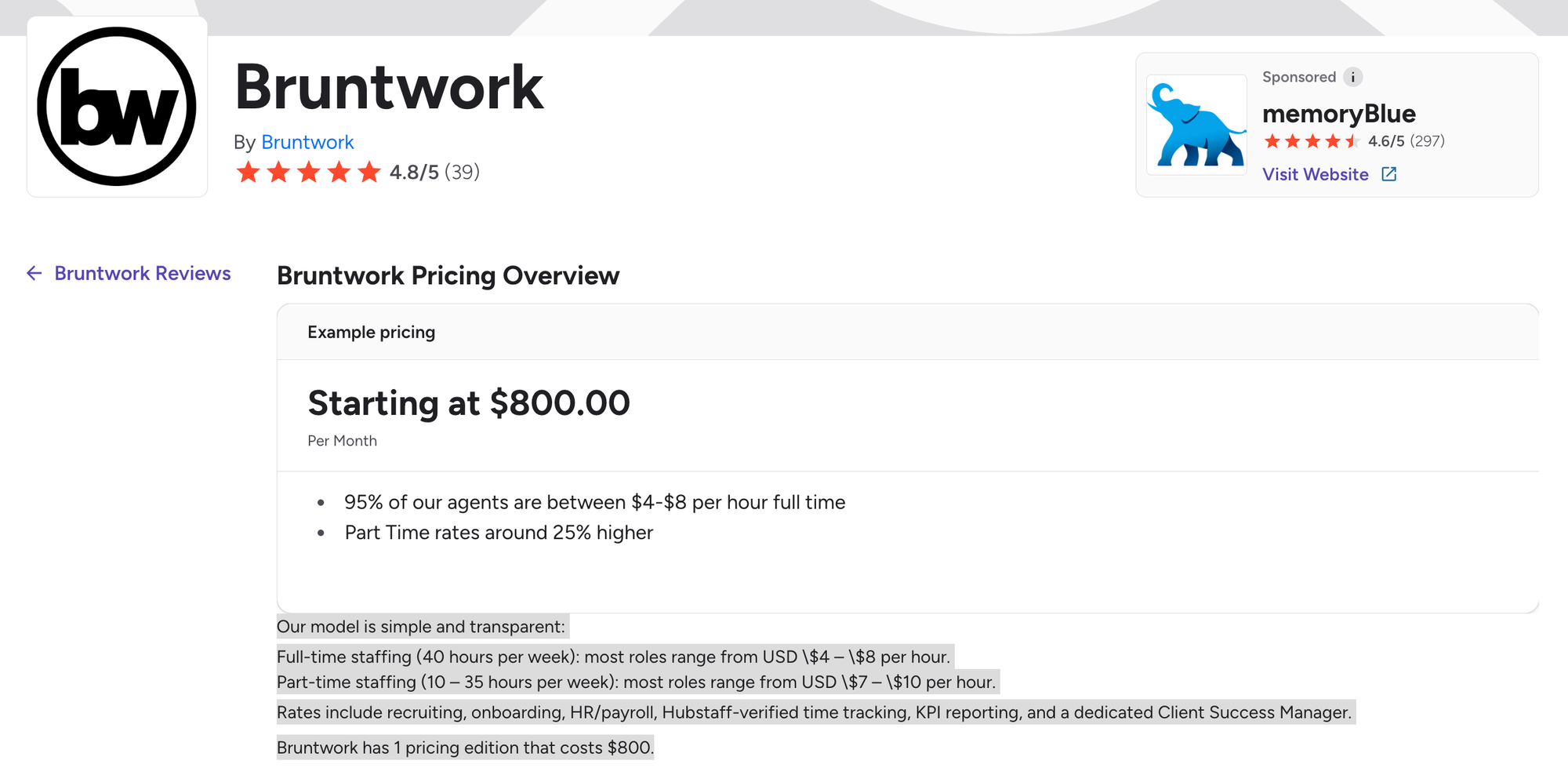 Bruntwork costs from $4/hour and go up to $17/hour for certain tasks. Virtual assistants deputed for specialized tasks are charged higher.