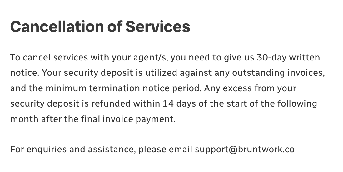 Bruntwork requires a mandatory 30-day notice before you can cancel. If you forget to give notice, your security deposit will be forfeited. But Wishup lets you cancel your VA plans anytime with zero penalties.
