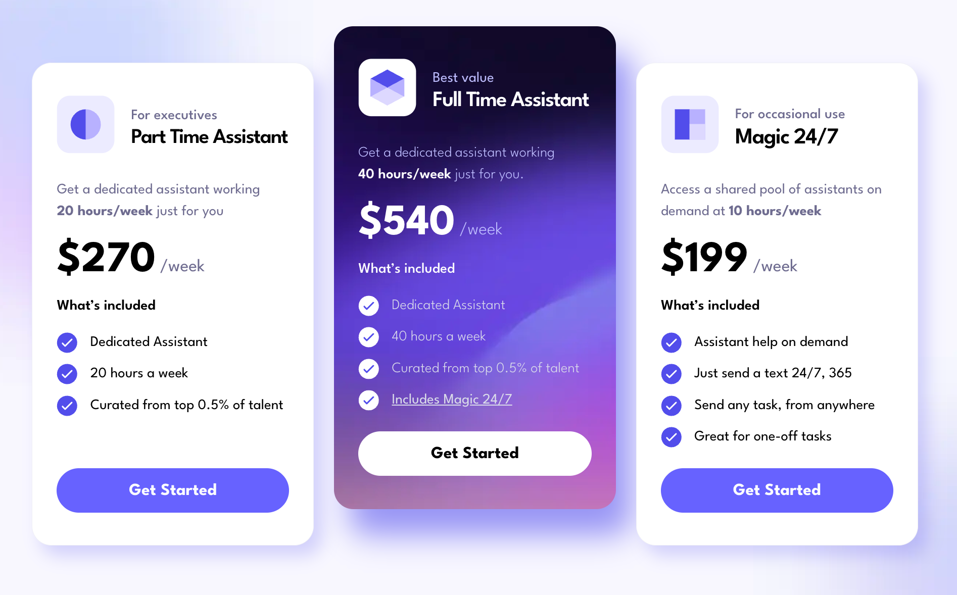 A Magic VA's pricing starts from $13.5 per hour. When you need support after the working hours of your Magic executive assistant, the cost goes up to $35 per hour after the initial free 20 hours.
