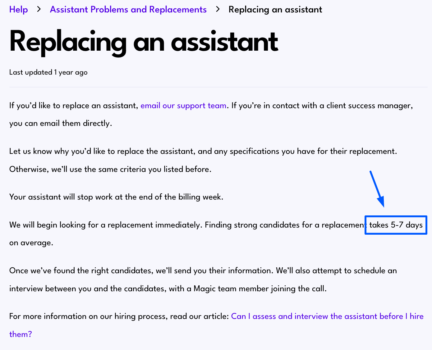 Replacement time: 5-7 days on average. If you're unhappy with your Magic virtual assistant, you’ll need to email a formal request explaining the issue. From there, Magic schedules new interviews to find a suitable replacement. This process can stretch over a week.