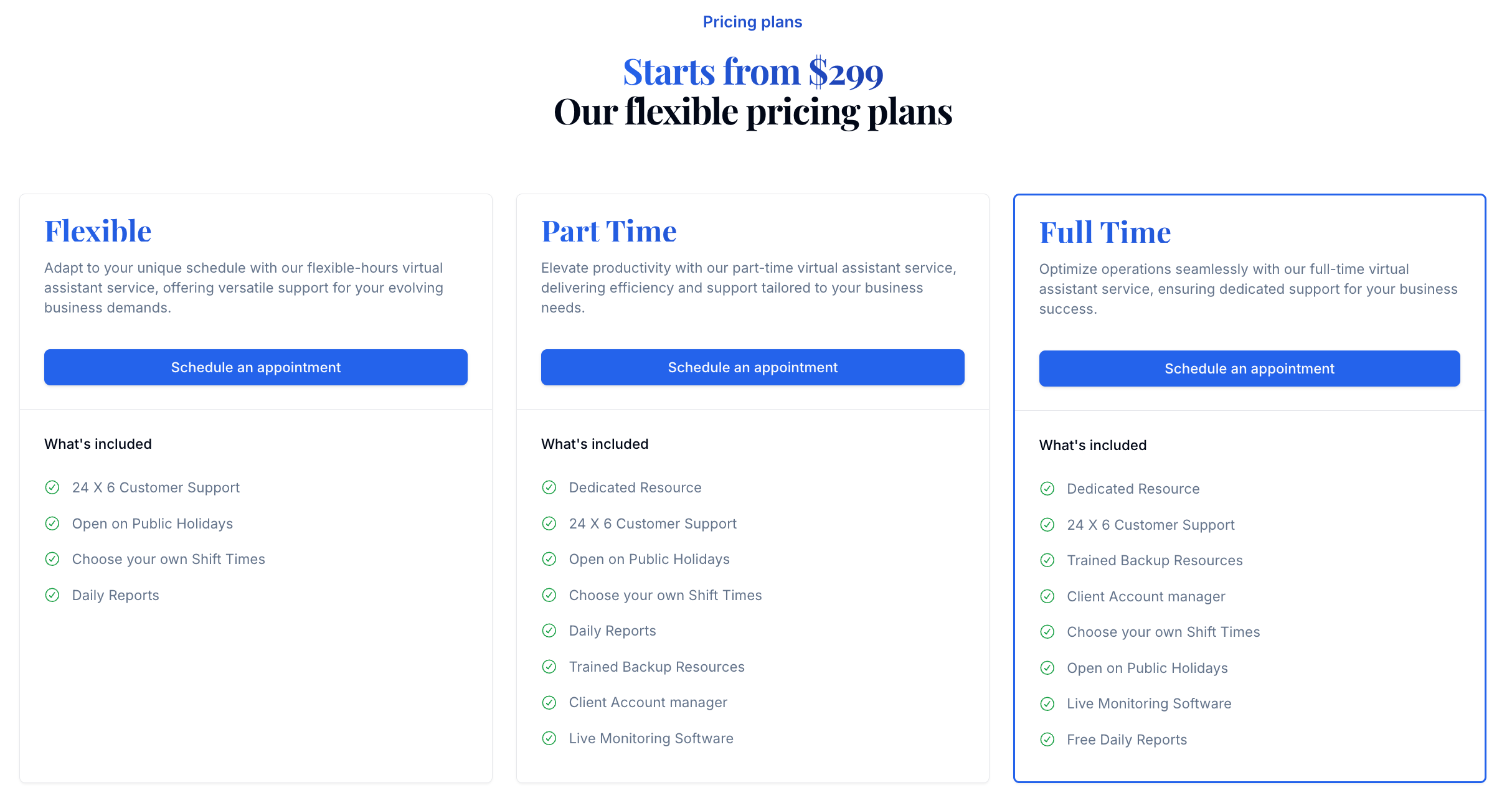 According to the latest details on their website, Patterns’ virtual assistant pricing starts from $299. They have three plans: Flexible, part-time, and full-time.