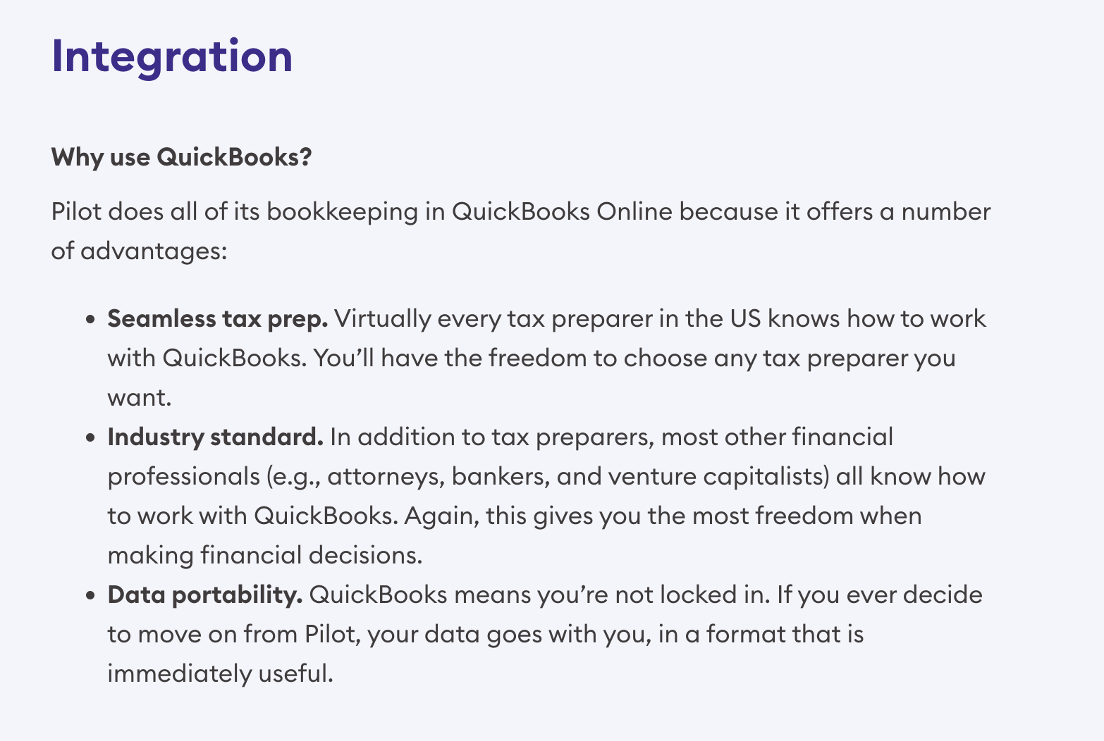 After signing up, Pilot pairs you with a dedicated bookkeeper who transfers your financial information to QuickBooks Online (QBO), their preferred software.