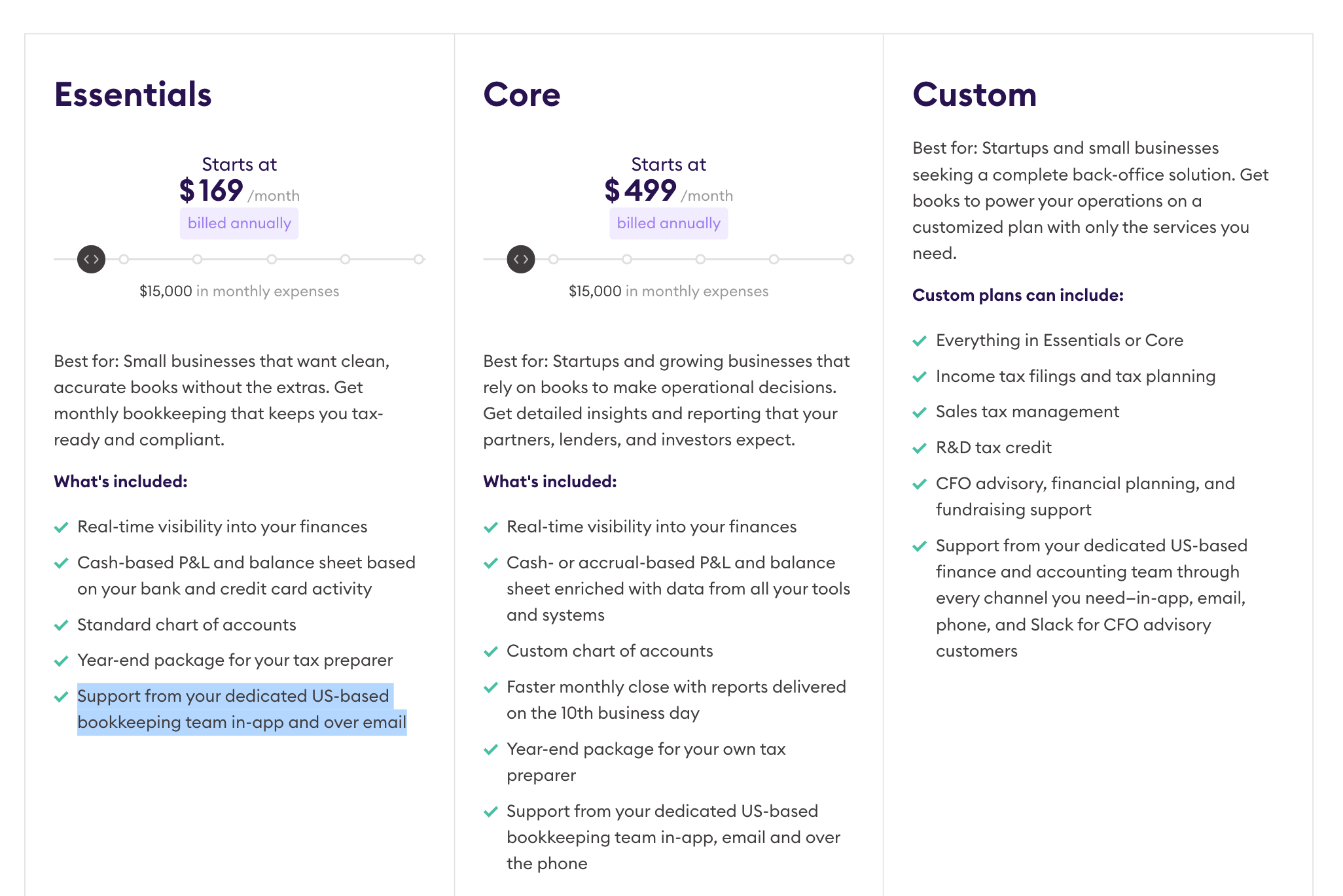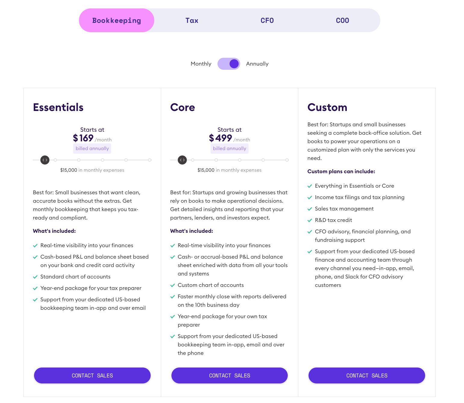 Pilot bookkeeping service starts at $169/month, billed annually but only with an annual prepayment. It goes up to $5250 per month for growing companies needing CFOs.